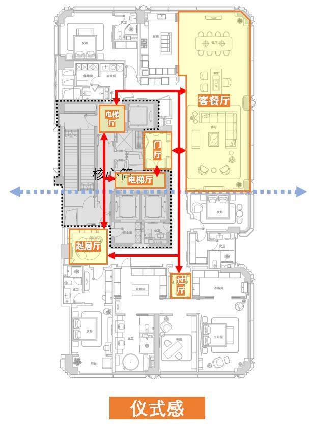 这个户型有3个出入口,动线绕着核心筒做了一个洄游。以客厅出入口为例:从电梯厅到门厅,再到客餐厅,最后到卧室的过厅,在动线上形成了一个完整的序列,营造出了一定的仪式感