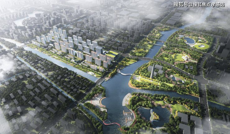 一界面是滨水景观界面(项目红线外),依托南侧的天然水系及滨水公园,打造慢行景观系统,并将滨河栈道、运动公园、骑行等多种功能嵌入,提升舒适度的同时,也为居民提供放松身心的好去处。