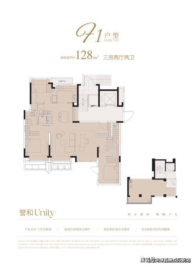 户型特色:82㎡户型三开间朝南,主卧套房配步入式衣帽间;120㎡户型约5.5米面宽横厅连接景观阳台;144㎡户型南北通透,约6.8米双联阳台。