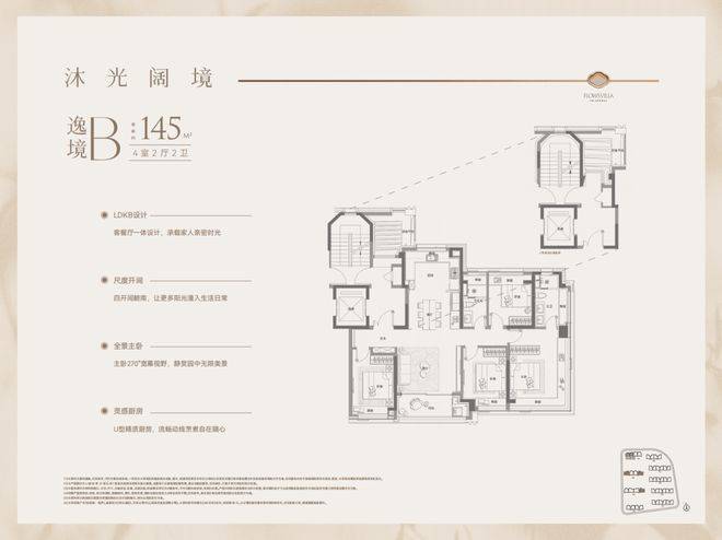 这个户型最大的亮点,总结起来就是:飞机户型、四开间朝南、南北通透、LDKB一体化设计、全屋飘窗、类一梯一户,极大程度保证了空间的高效利用,带来更通透、更舒展、更具尺度感的阔绰居住体验,每一平米都在放大招,适合多代同堂或追求大空间的家庭!