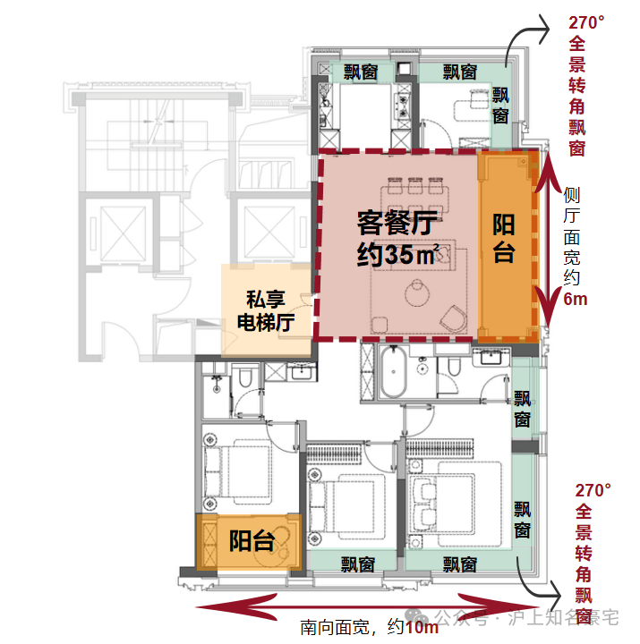 这个户型南向面宽约10米,设计上不走寻常路,打造环岛式侧厅,侧厅面宽近6米,联动同面宽多变阳台,形成约35㎡的开放式社交核心场域!
