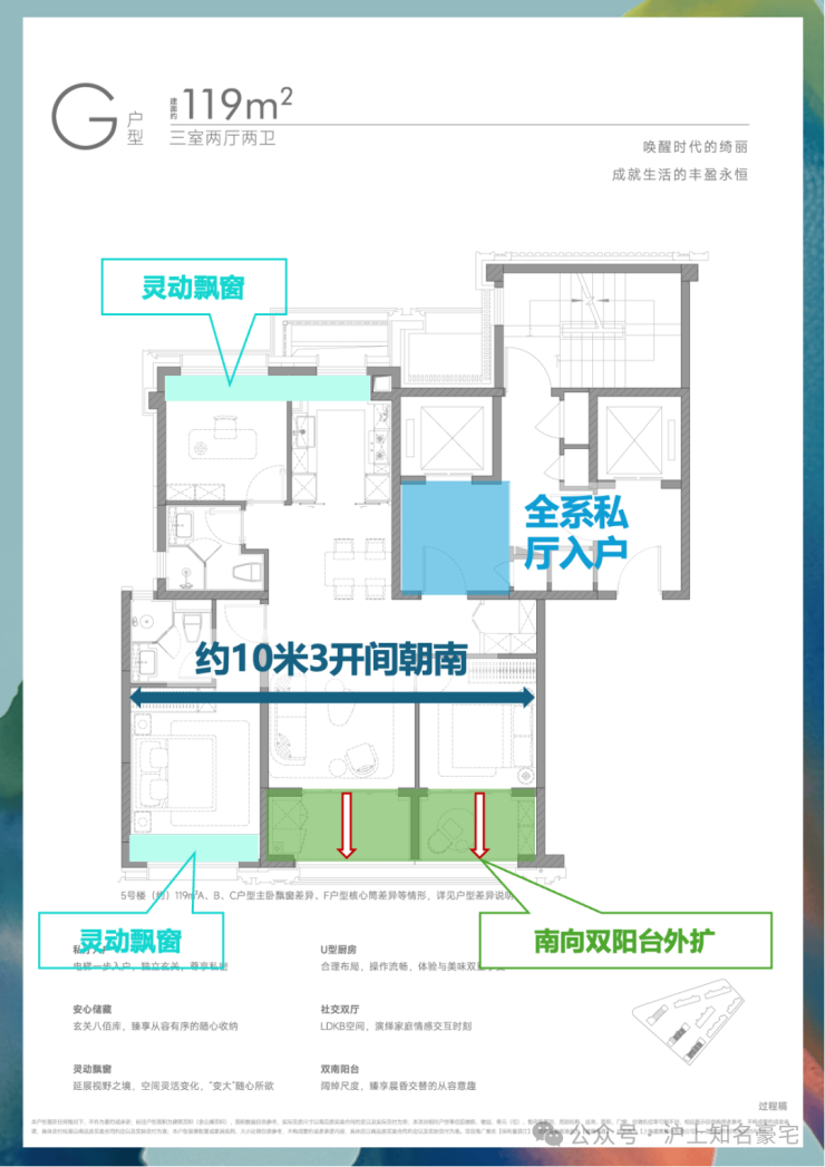 户型设计全屋飘窗与大尺度阳台,采光度全面提升,空间感倍增!全屋赠送飘窗面积约12㎡(不计容)可自主改造,阳台总面积约14㎡(一半计容)搭配约7㎡的入户私厅,户型实得率超高!