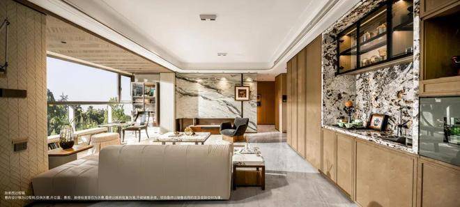 电视背景墙颜值很高,「新芬迪白」石材独特的纹理看着更像是艺术品,更是采用了丝滑的弧形转角,空间更加柔和;