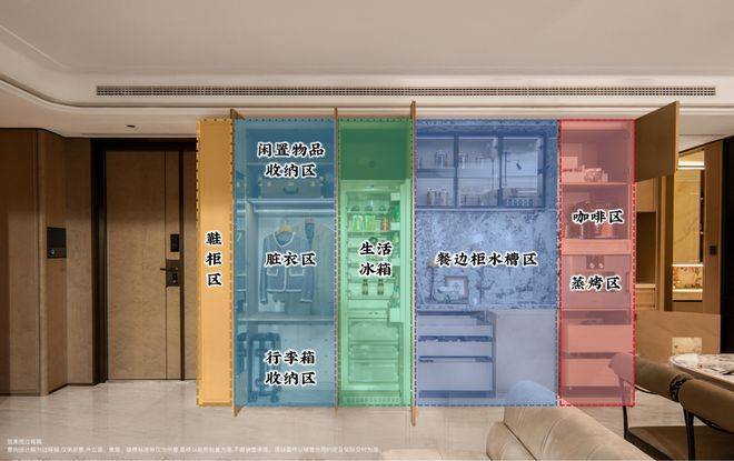 集合了玄关收纳+餐边柜收纳+厨房收纳为一体,实现了更丰富的收纳功能: