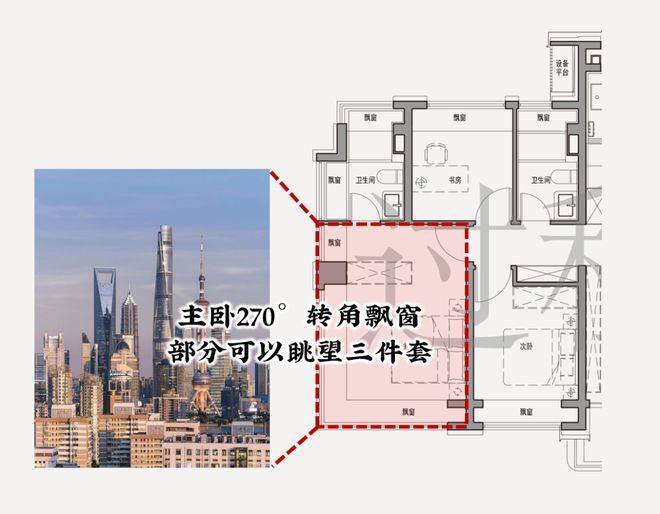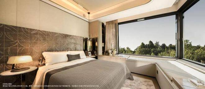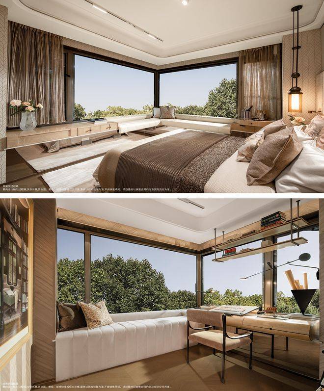主卧270°全景仓:主卧做了270°IMAX全景飘窗,走进卧室就能被两侧城市美景包围,部分房源可以远眺三件套,躺在床上可以欣赏远处天际线的霓虹闪烁。