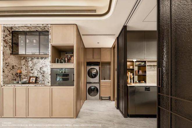家政间交付做了上下水通道、移门、洗衣机、烘干机,洗衣机的上方还配置了一组柜子和晾衣区,甚至扫地机也安排了位置。