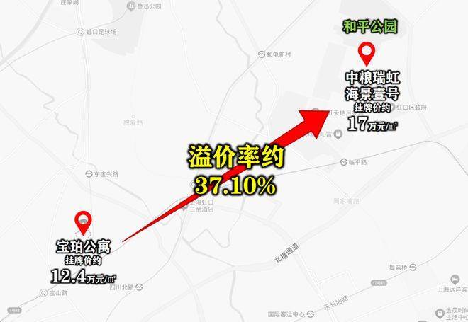 比如均为内环内2023年的次新房,直面和平公园的中粮瑞虹壹号的挂牌均价,要远高于没有公园加持的宝珀公寓。