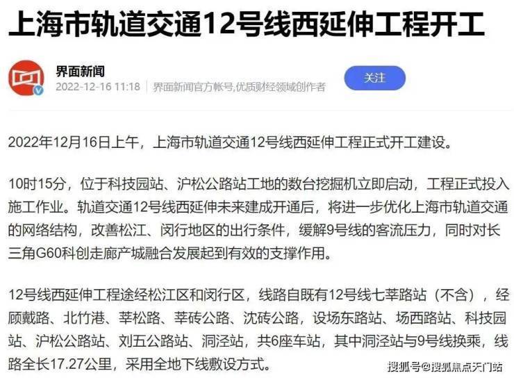 目前12号线西延伸正在加速推进,预计2027年底开通试运营。12号线西延伸在松江境内从G60云廊沿沈砖公路,东西向穿过洞泾,设沪松公路和刘五公路设站,在洞泾站与9号线交汇。