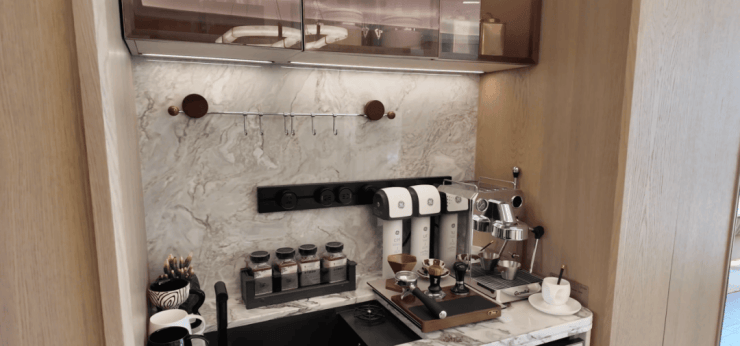相比保利天奕每个卧室空间体感会更好,这个户型厨房选用的是博世油烟机、三眼燃气灶、嵌入式蒸烤箱,包括玄关柜和餐边柜也是交付范围内。