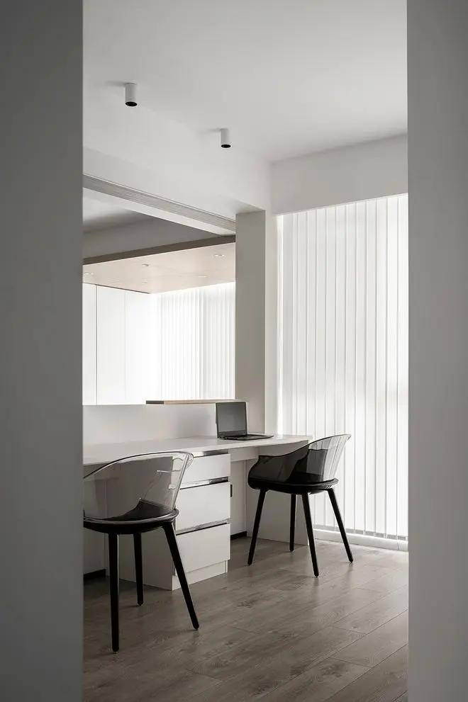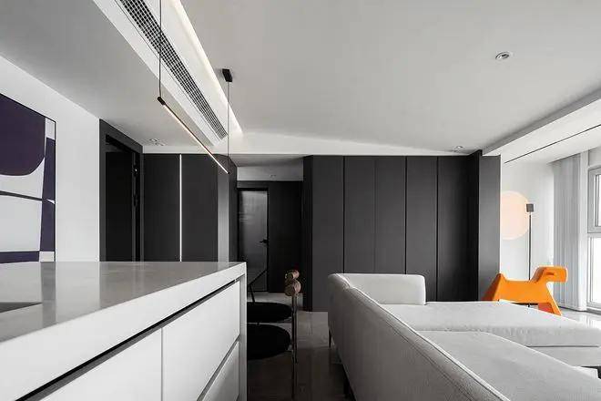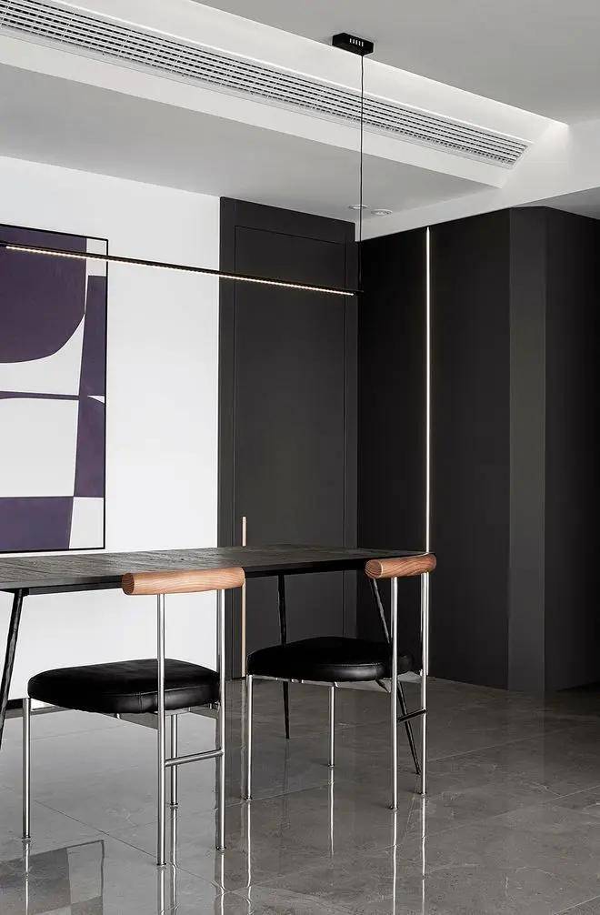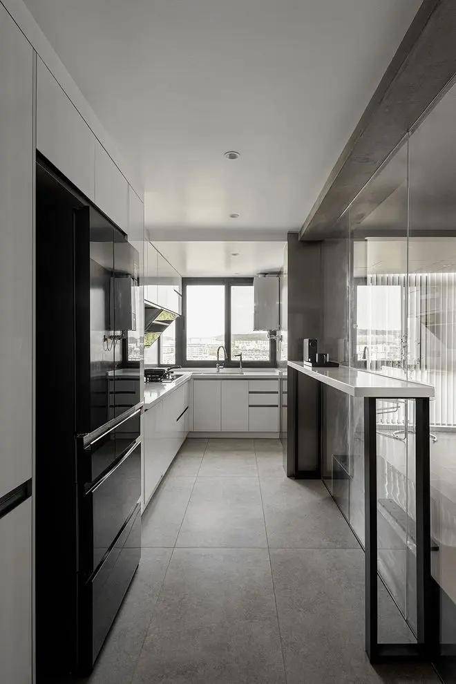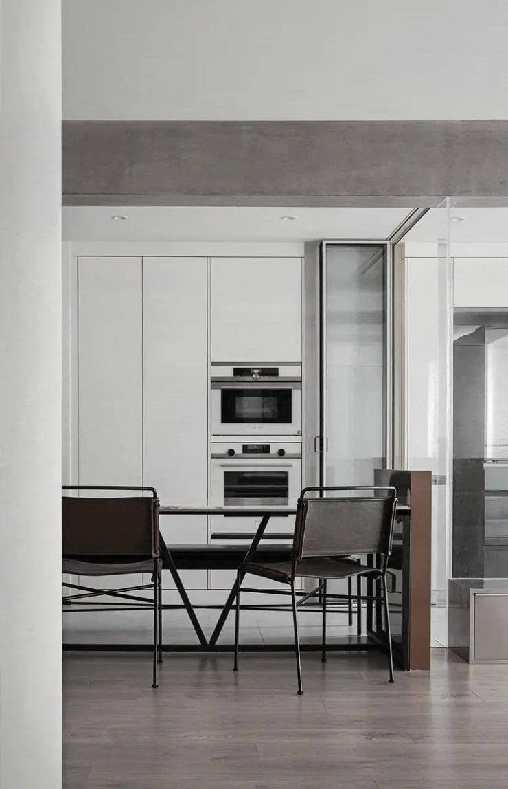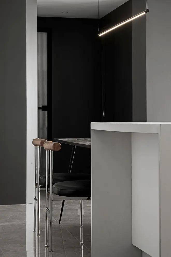 另一个空间亦秉持现代简约的设计理念,以黑白灰为主色调,简洁的线条与纯粹的美感在此空间中交织。客餐厨的无缝衔接设计,不仅让空间更显通透宽敞,更凸显了设计师的匠心独运。餐桌与岛台的紧密结合,黑与白的经典对比,无不展现出设计师对细节的极致追求与对简约美学的深刻理解。