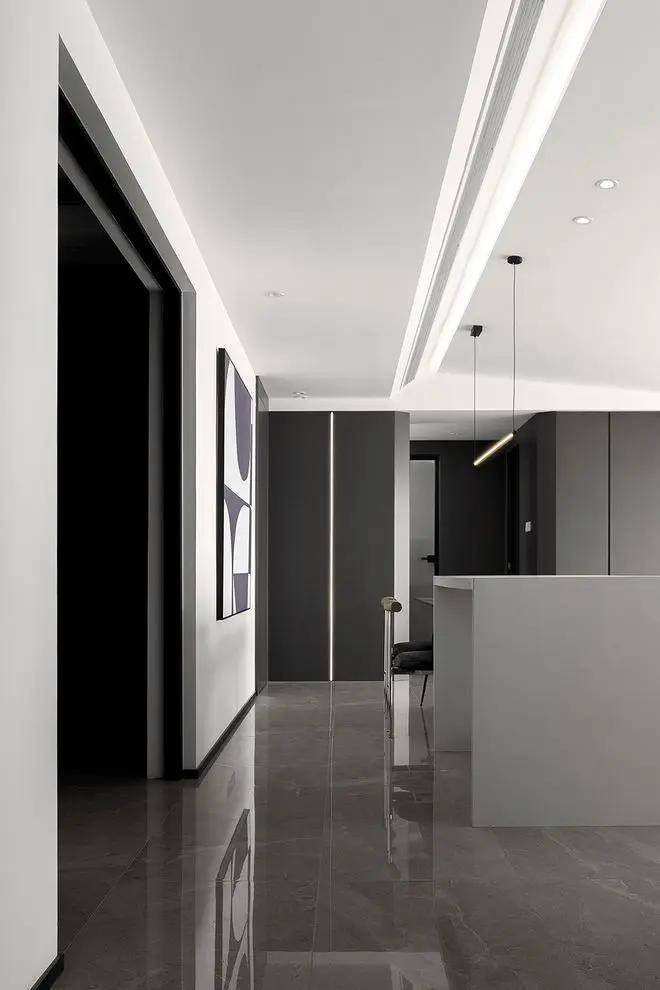 入户门直接面对一个宽敞的开放式玄关,采用大胆的黑色与白色的对比,使整个空间显得更为现代和时尚。高柜的设计也不再局限于厨房,而是延伸到玄关区域,既作为收纳空间,又作为隔断,增强了空间的层次感。
