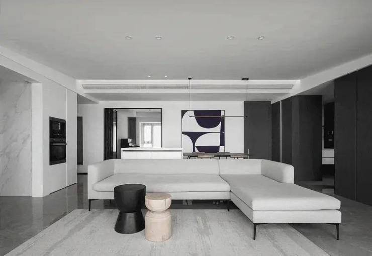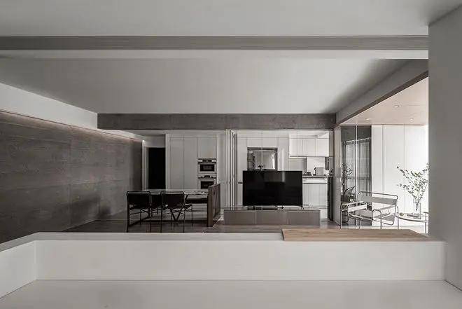 Another space adheres to the modern minimalist design principle, with a black, white, and gray color palette. Clean lines and pure aesthetics coalesce in this space. The seamless integration of living, dining, and kitchen areas not only enhances the openness and spaciousness but also highlights the designer's meticulous attention to detail and profound understanding of minimal aesthetics.
