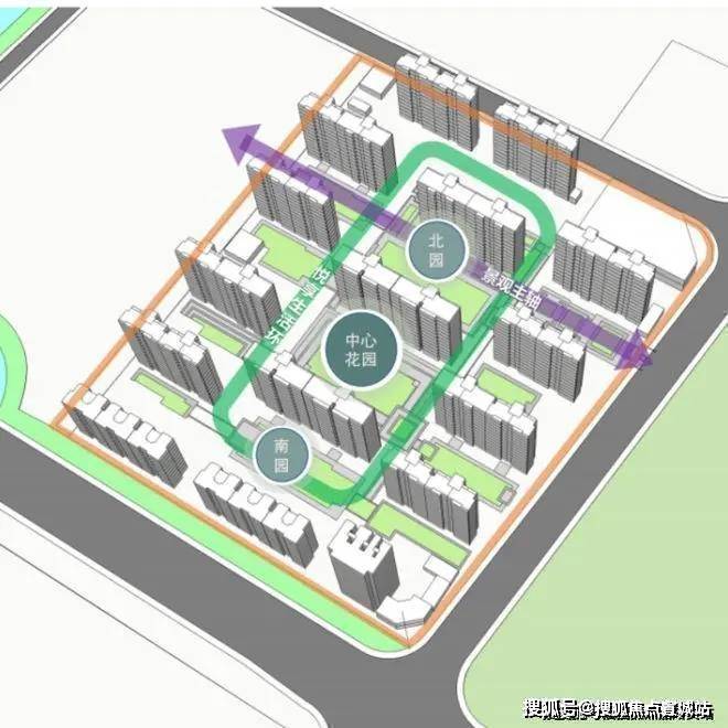项目精心规划“一环一轴三园”,于建筑中另辟一方天地,以绿意包裹整个小区,打造绿氧环绕的公园住区。