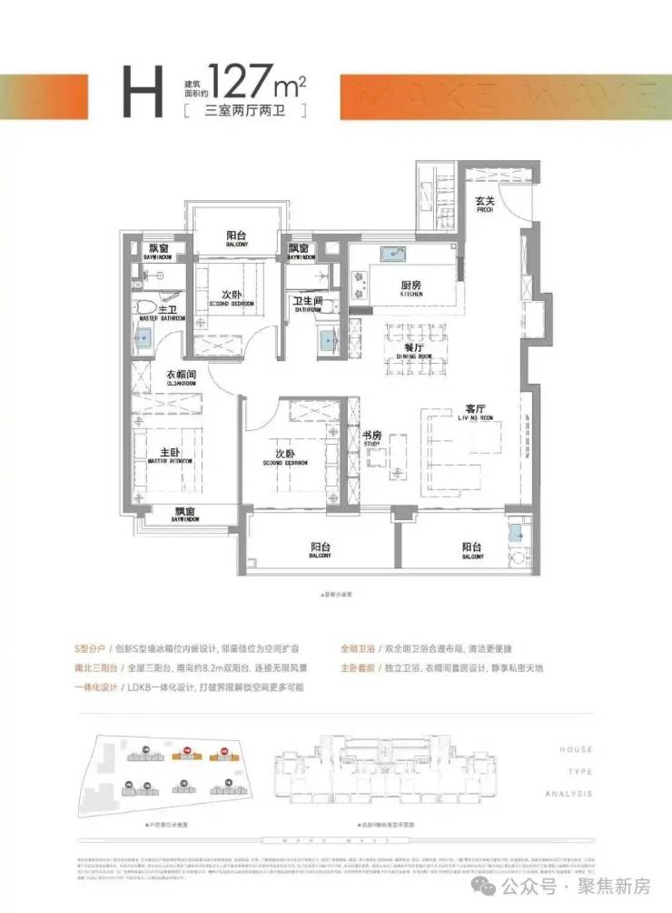 建面约127㎡三房两厅两卫,该户型最大的亮点是有着比肩豪宅的南北三阳台黄金布局,这是2025年之后,松江首个三阳台户型。
