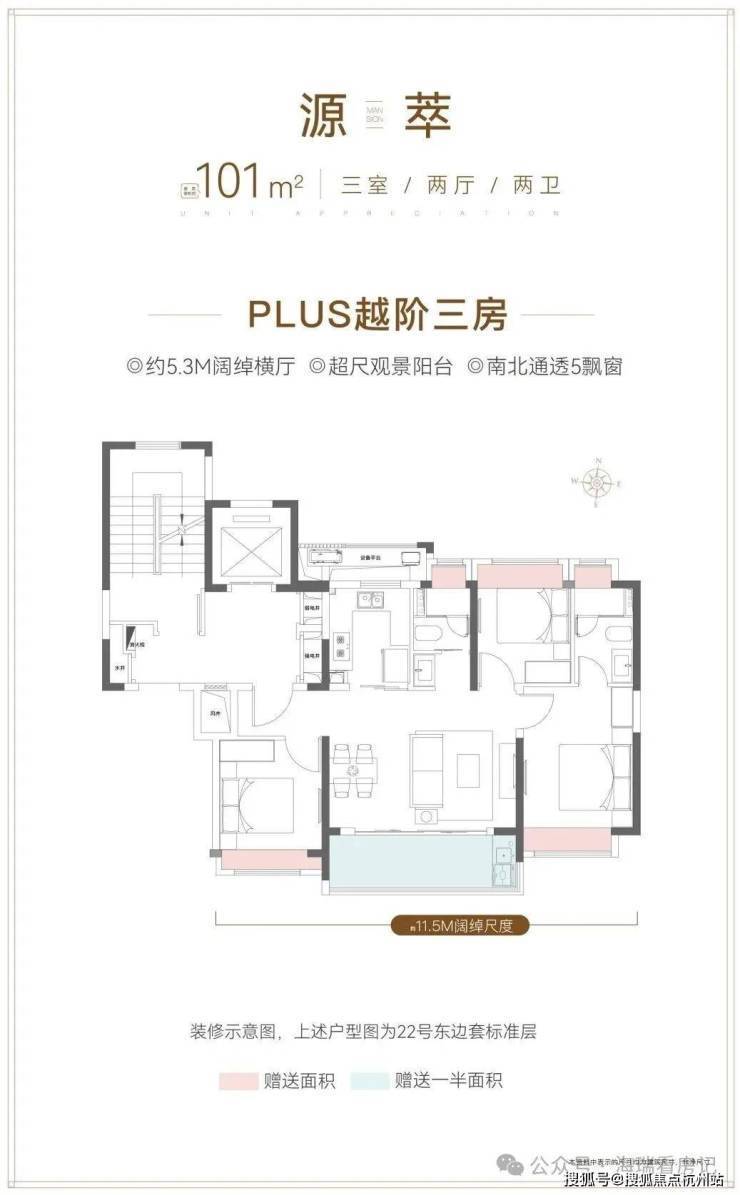 101㎡三房:三开间朝南,南向面宽约11.5 米;5.3 米横厅+ 阳台,空间开阔;高得房率(约79%),多飘窗拓展面积。