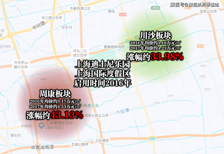 大型度假区对板块楼市同样有着不小的加持,上海迪士尼乐园所在的川沙和临近的周康板块,都在度假区落成后一年之内猛涨了一波。