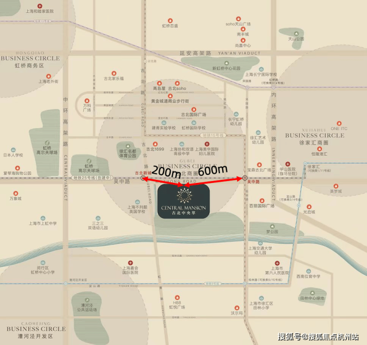轨交方面: 「古北中央萃」是准双轨交的地铁房,现有的是直线距离约700米的最美地铁站之一的15号线吴中路站,未来还会有25号线的古北新城站,站点位置就设在「古北中央萃」西侧不远处。