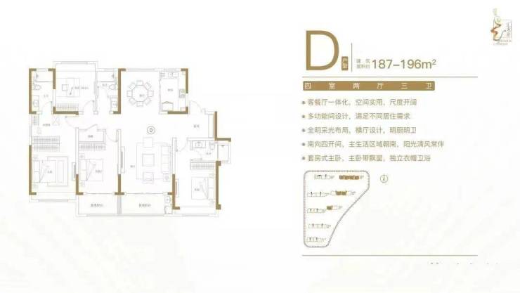 建面约187-196㎡四室两厅三卫户型特点:户型方正,南北通透,动静分区有序;双套房设计,卧室带飘窗,独立卫生间;客餐厅一体化,尺度开阔,全家共享;全明采光布局,告别暗房,明厨明卫;南向四开间,阳光清风常伴。