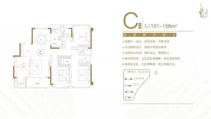 建面约151-158㎡四室两厅两卫户型特点:空间灵活,满足不同家庭阶段需求;客餐厅一体化,增大实用面积;双阳台设计,全明采光,通透舒适;南向四开间,户户飘窗,采光通风性俱佳;套房式主卧,独立卫生间。