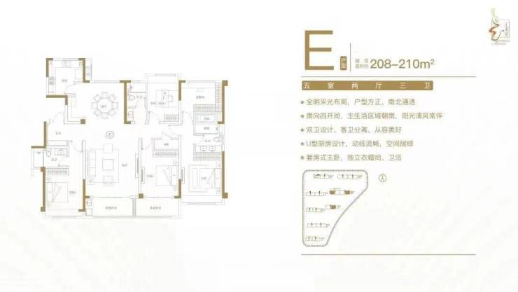 建面约208-210㎡五室两厅三卫户型特点:全明采光布局,户型方正,南北通透;南向四开间,主生活区域朝南,阳光清风常伴;双卫设计,客卫分离,从容美好;U型厨房设计,动线流畅,空间阔绰;套房式主卧,独立衣帽间、卫浴。