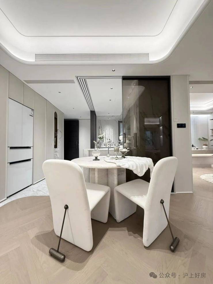 比如,弧形、奢石与灯光等相得益彰且设计感满满的架空层。