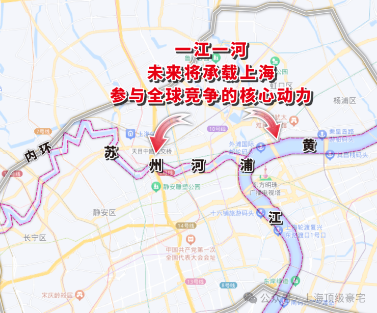 在静安、闸北合并之后,这片土地的城市更新速度加快,苏河湾板块在2016年的苏河湾十三五规划期间,将目标定位:“要重新拿回上海‘都市之心’的宝座”,在随后的“2035规划”中,苏河湾更是被布局为世界级中央活动区,未来将是城市封面的存在。苏州河站位“一江一河”规划,对于上海来说,未来苏州河沿岸应当是比黄浦江更适宜居住的存在。