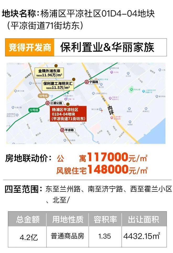 2023年12月,第四轮土拍中,华丽家族&保利以总价41885万元,拿下了杨浦区平凉社区01D4-04地块(平凉街道71街坊东),容积率1.35,溢价率0%,楼板价70002元/㎡,装修标准不低于40000元/㎡,房地联动价公寓117000元/㎡,风貌住宅148000元/㎡。