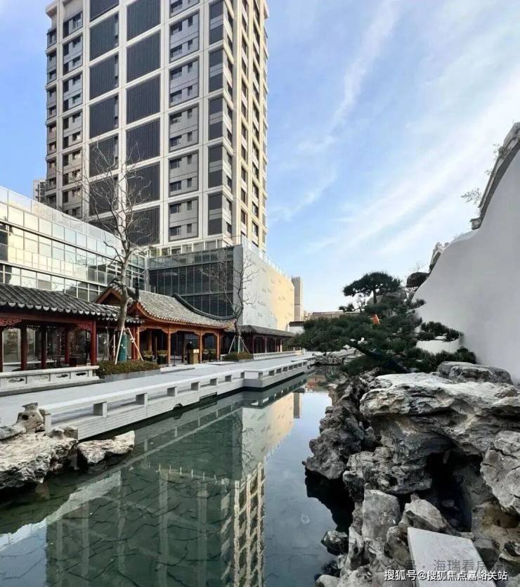 景观的设计非常有巧思,据说灵感来自于老城厢的露香池,通过复刻露香池八景,在有限的空间内营造出亭台楼榭的江南园林的中式雅风。