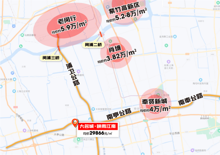 老闵行价格已达到5.9万/㎡,奉贤新城价格也在4万/㎡+,大名城·映雨江南均价29866元/㎡,价格差非常明显。
