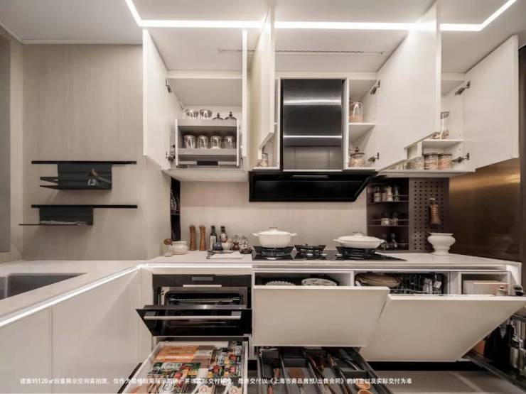 全屋定制柜体,其中就连120㎡户型收纳容积约14600L,行李箱、换季被褥、杂物全藏起来。