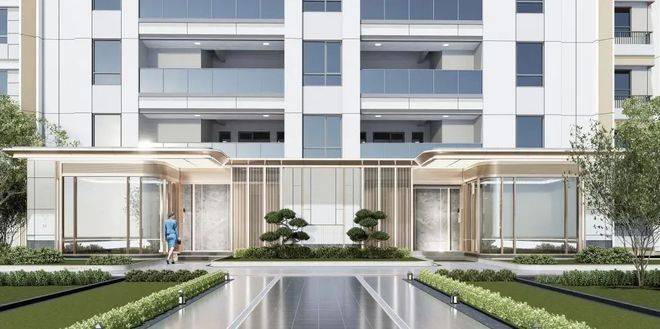 社区入口对标慢奢酒店风格打造,融入高定细节,诸如酒店感仪式门头+环岛式尊贵落客+迎宾式花园设计+精装地库等。