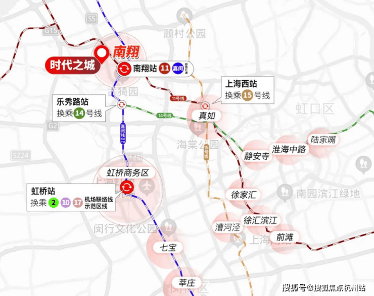 交通上,时代之城所拥有的 11号线+嘉闵线双轨通勤, 距离地铁 11 号线陈翔公路站约900米,半小时就能到达徐家汇等市区核心腹地。包括静安寺、徐家汇、徐汇滨江、漕河泾、陆家嘴、新天地都在业主的生活圈内。
