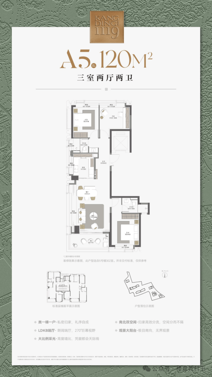 建面约120㎡边套3房:位于整个社区的最西侧,约270°的巨幕视野让这个户型的采光、视野达到顶峰,低总价的上车首选;