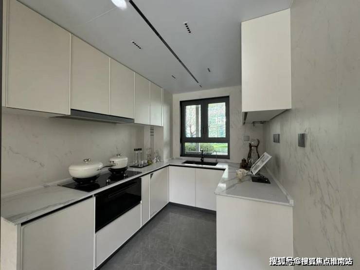 厨房是带岛台交付的U型厨房,厨具品牌为西门子四件套,另外还有双开门冰箱,线性凉霸、科勒单槽。