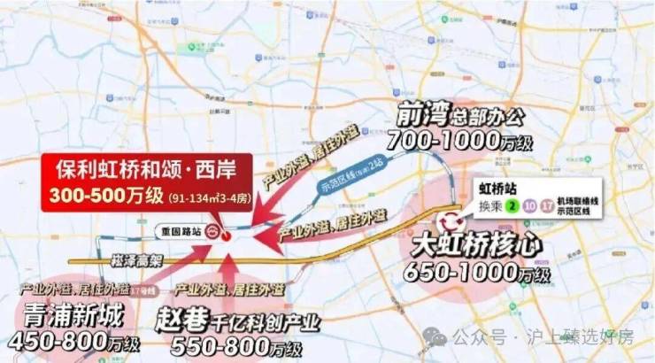 从周边区域房价来看,东面2站之隔的前湾,房价已达700-1000万级;徐泾650-1000万级,赵巷550-800万级,即便下游的青浦新城,房价也处于450-800万级