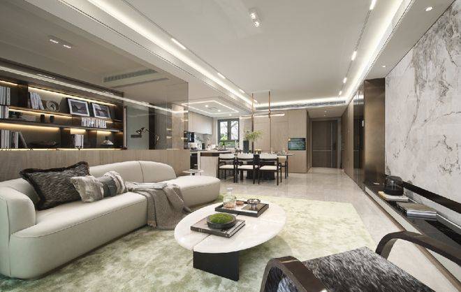 而在硬性标准之上,保利·海上瑧悦还充分融合了东方文化高定细节!比如说,客厅整面交付的大面积岩板背景墙均为东方定制款式,采用的是水墨丹青和徽州印象样式,配色风格凸显东方风雅;