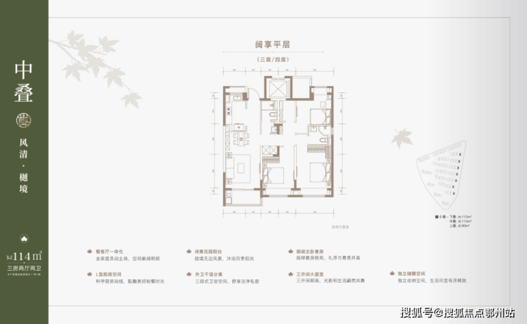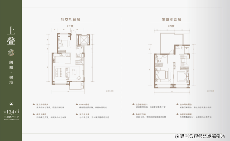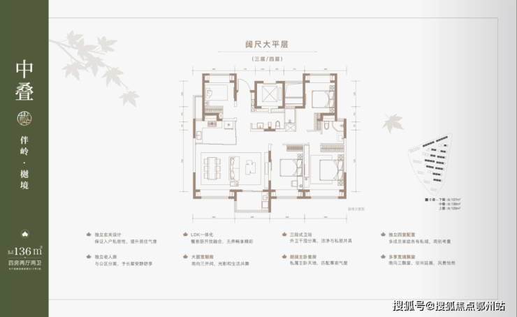 建面约137㎡下叠, 四房两厅三卫 全能格局,非常适合二娃家庭以及三代同堂。