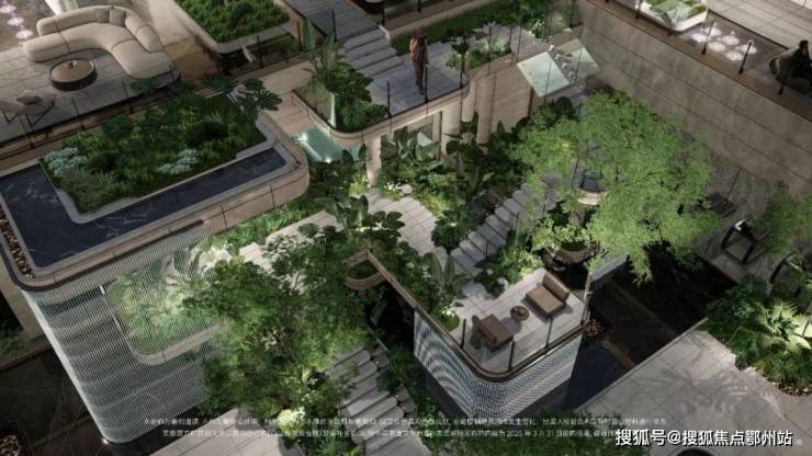 社区景观方面,项目运用室内手法室外化设计构想,将 垂直景墙、悬浮观景台与叠水景观立体穿插,形成情随境转的沉浸式体验,自然元素渗透进室内,并与室内空间动态互动。