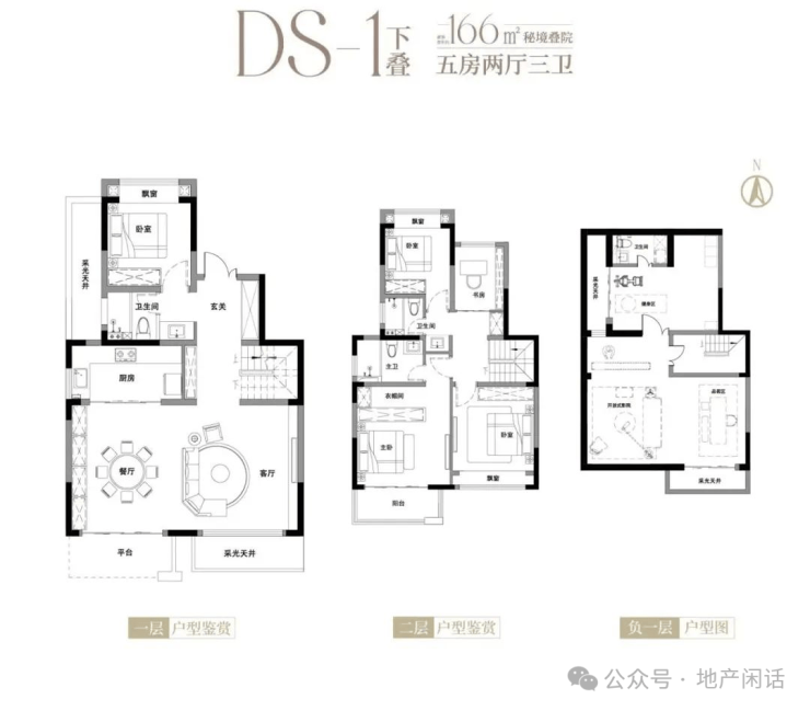 约166平五房下叠,一层为餐客厅搭配老人房,二层为三卧室+书房,功能区分错落有序;