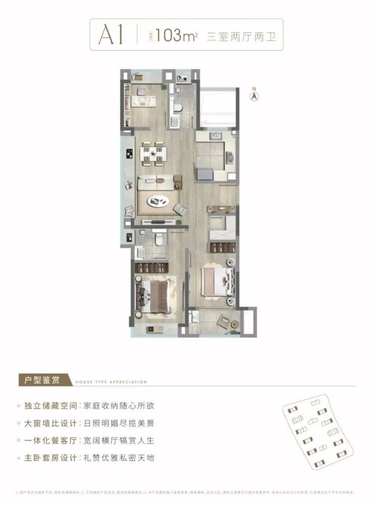 建面约103㎡3房2厅2卫,边套户型,做到了三个面采光+双开间朝南+主卧套房设计+南北通透,室内通透明亮。