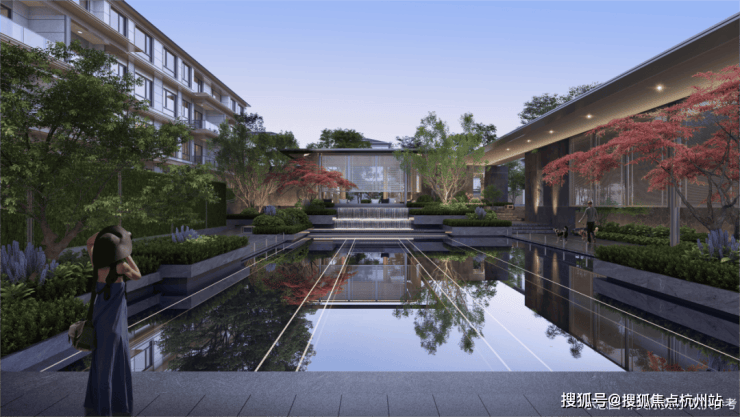 中央水景联动地面景观及地下会所空间,通过三层叠水形成了特色鲜明的水景庭院,引领未来社区发展新趋势。