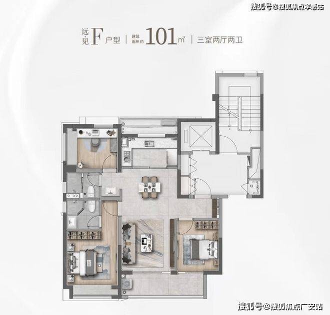 建面约101㎡的F和G户型都是市面上备受认可的飞机经典款户型。