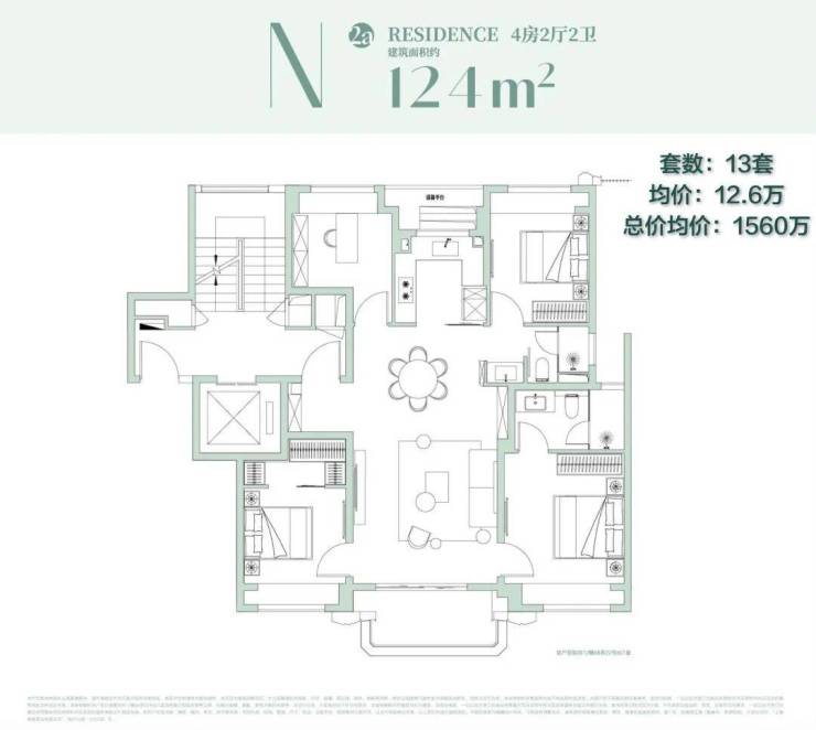 3、124㎡洋房:正对社区中央景观,非常经典的四叶草户型,面积控的非常极致的滨江四房产品。