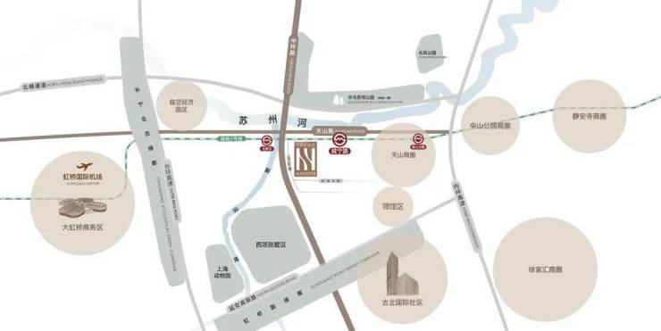 【地铁2号线】直线距离威宁路站约800m,北新泾站约200m,东向2站中山公园,4站静安寺,6站人广,9站陆家嘴,直抵浦东国际机场,西向3站虹桥2号航站楼,4站虹桥火车站,是上海名副其实的国际线。