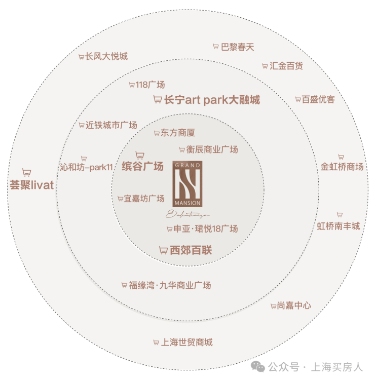 商业方面:北新泾站上盖规划约5万㎡商业综合体,与周边百联西郊、缤谷广场形成“15分钟消费圈”,辐射临空经济园区高净值人群。步行700米至百联西郊购物中心(重装开业),1站地铁至威宁路站缤谷广场,2站至中山公园龙之梦。3公里内覆盖古北黄金城道、ART PARK大融城等高端消费圈。
