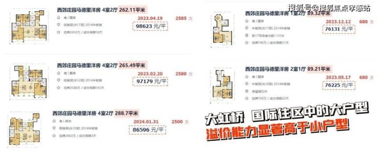 一方面,大虹桥有标杆项目珠玉在前。比如西郊庄园马德里洋房,其90㎡二手房成交价约7.5万/㎡,但260㎡就高达约8.6-9.8万/㎡,大户型溢价更高。