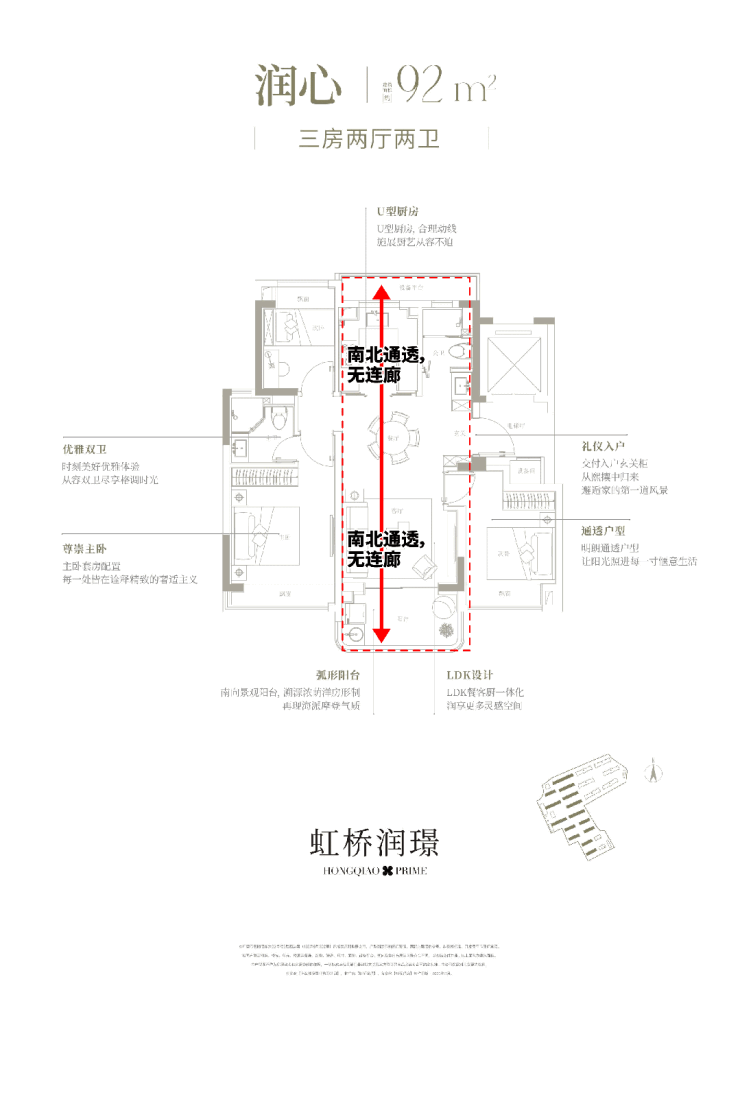飞机户型设计没有动静分区专属的“室内连廊”,空间利用率高;同时还能做到真正南北通透,南接不封闭瞰景阳台(不封算一半建筑面积),厨房北侧无连廊(采光、隐私更好),再叠加很大的窗墙比,进一步放大室内的采光、通透性!示意图 实际以交付为准