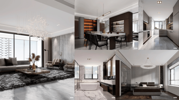 立面材料选取稍显沉稳的“皇室啡”花岗岩,其特殊的颜色与纹理,既能与北侧的办公统一色调风格,也能和周边现有的高容积率建筑,以及绿树成荫的街道环境融为一体,呈现低调精致、简洁大方的高品质住宅形象。