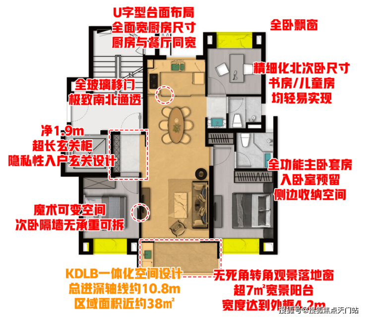 入户玄关及超大玄关柜设计,三开间朝南飞机户型,KDLB一体化设计,客厅次卧魔术可变空间,U型厨房,大尺度宽景阳台+转角观景落地窗,舒适北卧,三段式干湿分离客卫,全卧室飘窗,等等