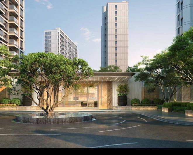第一重——酒店式环道落客、现代精奢大堂、悬廊叠瀑水岸会客厅,移步异景,漫游归家入户;